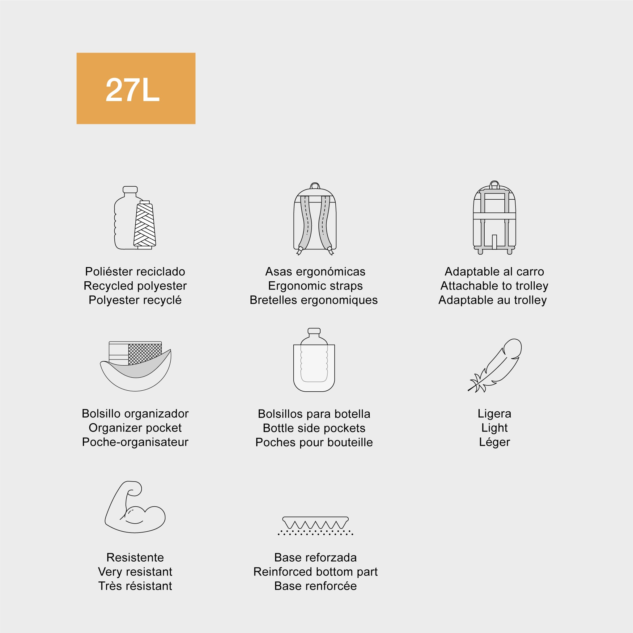 Er ist leicht, hat einen verstärkten Boden mit Kunststofffüßen und einen Riemen zur Befestigung an einem Koffer. In den oberen Fächern gibt es zusätzliche Taschen, eine für einen Laptop und die andere mit Reißverschluss. Das vordere, kleinere Fach hat eine Netztasche mit Reißverschluss, um kleine Gegenstände zu organisieren, und die seitlichen Flaschentaschen ermöglichen einen schnellen Zugriff auf ein Getränk.