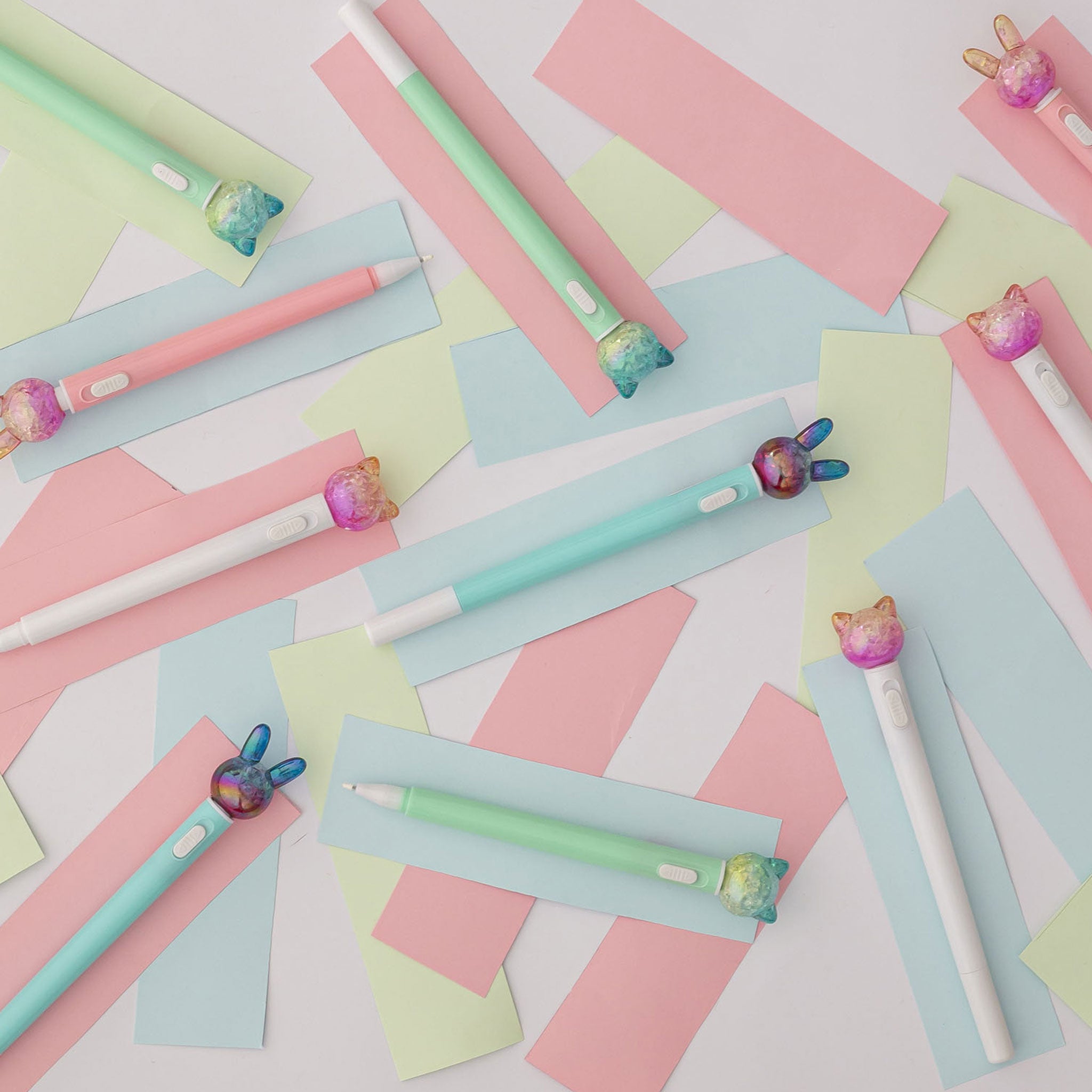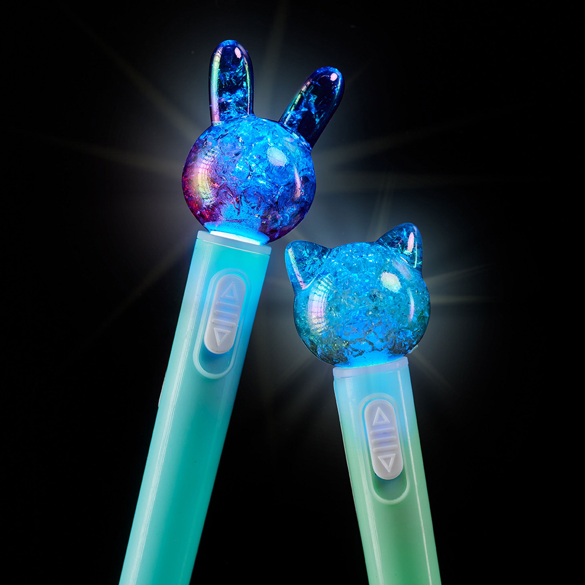 Ein lustiger leuchtender Stift mit deinem Lieblingstier. Erhältlich in 4 Designs: blauer und rosa Hase und grünes und weißes Kätzchen. Mit einem Knopf, um das farbige Licht zu aktivieren. Enthält 3 LR626-Batterien. Ideal für den Gebrauch zu Hause und in der Schule.