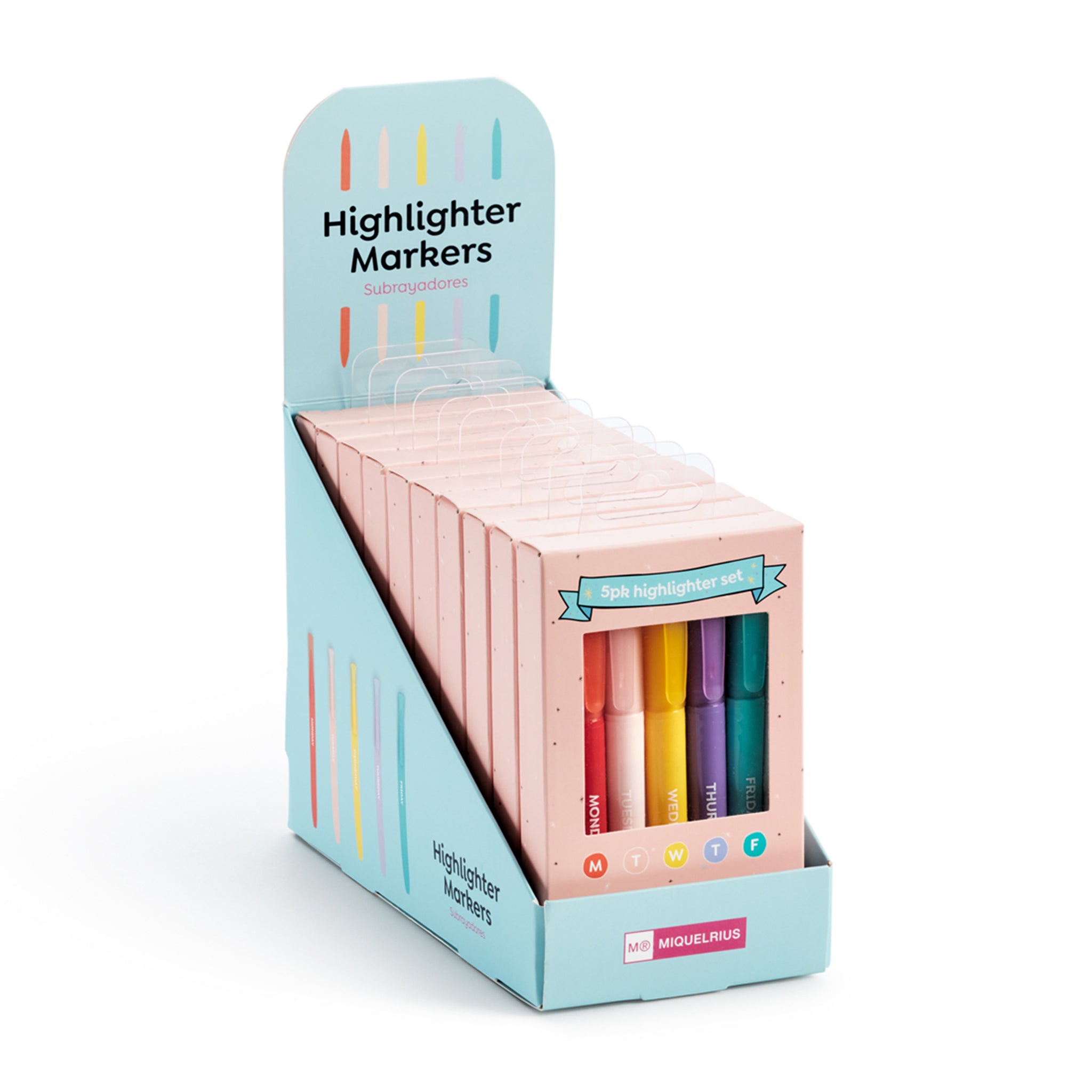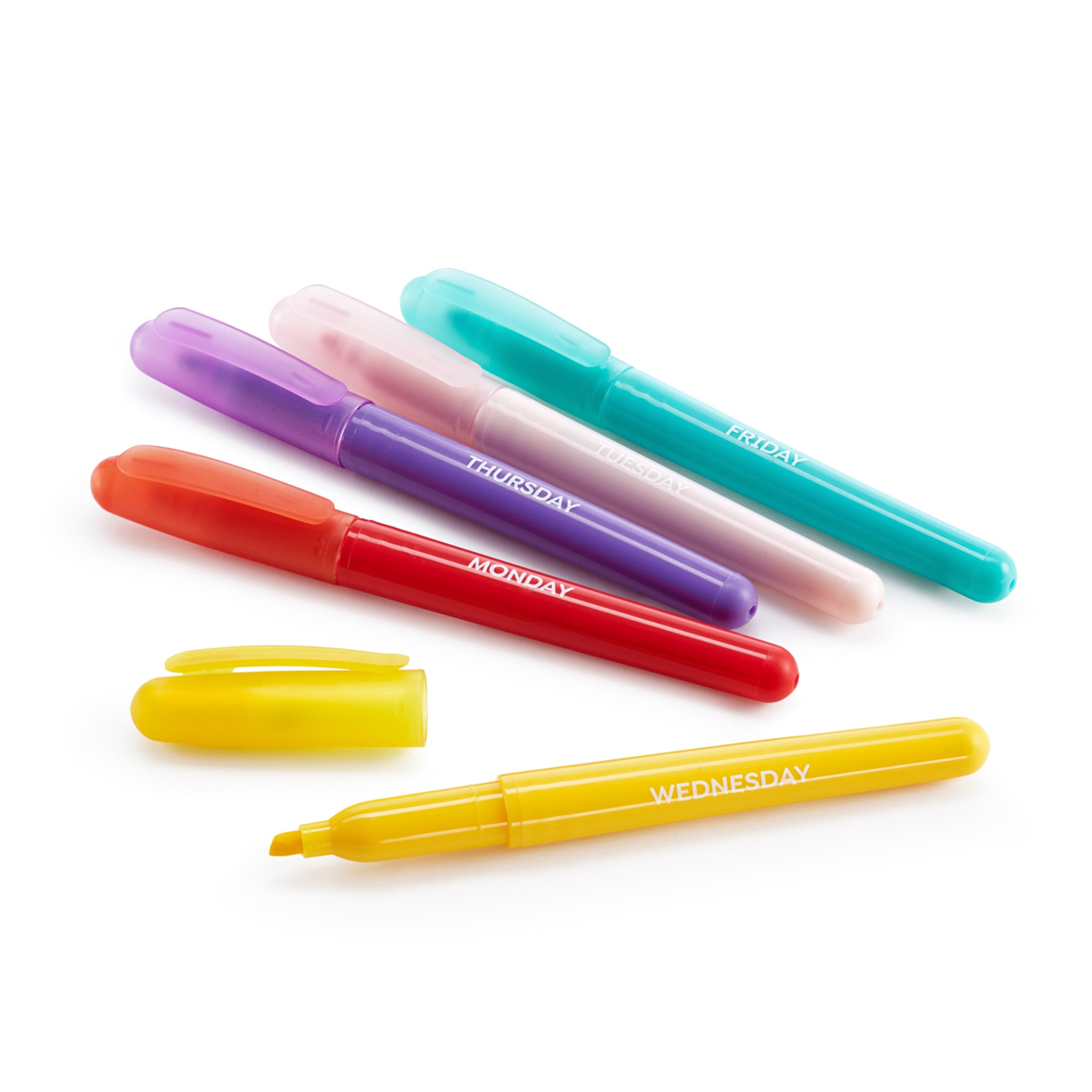 Bunte Textmarker aus der Back2Fun-Serie. Die Packung enthält 5 Marker in saftigen Farben: rot, pink, gelb, lila und grün. Jeder Marker ist mit einem der "Schul"-Wochentage beschriftet, z.B. Rot ist Montag. Die Textmarker sind perfekt für Zuhause, die Schule oder das Büro.