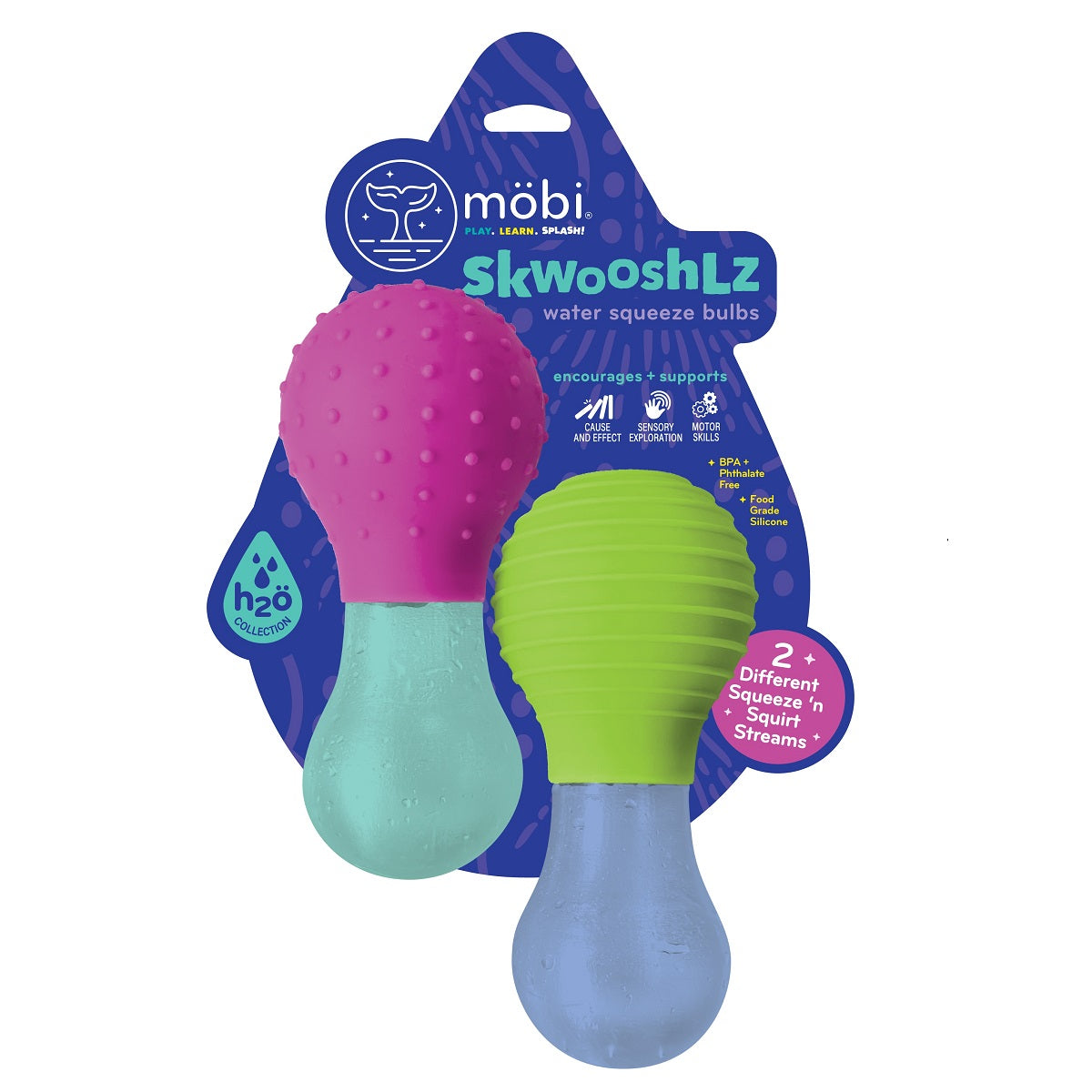 Zwei Badespielzeuge – Wasserblasen von Mobi. Schrauben Sie die Blase auf, füllen Sie Wasser ein, schrauben Sie sie wieder zu, drücken Sie auf die weiche Blase und sehen Sie, wie das Wasser herausspritzt. Die Spritzflaschen haben verschiedene Öffnungen, damit das Wasser unterschiedlich herausfließt. Ein großartiges Sinneserlebnis für das Wasser und darüber hinaus. Die Spritzflaschen sind aus hochwertigem Silikon gefertigt.