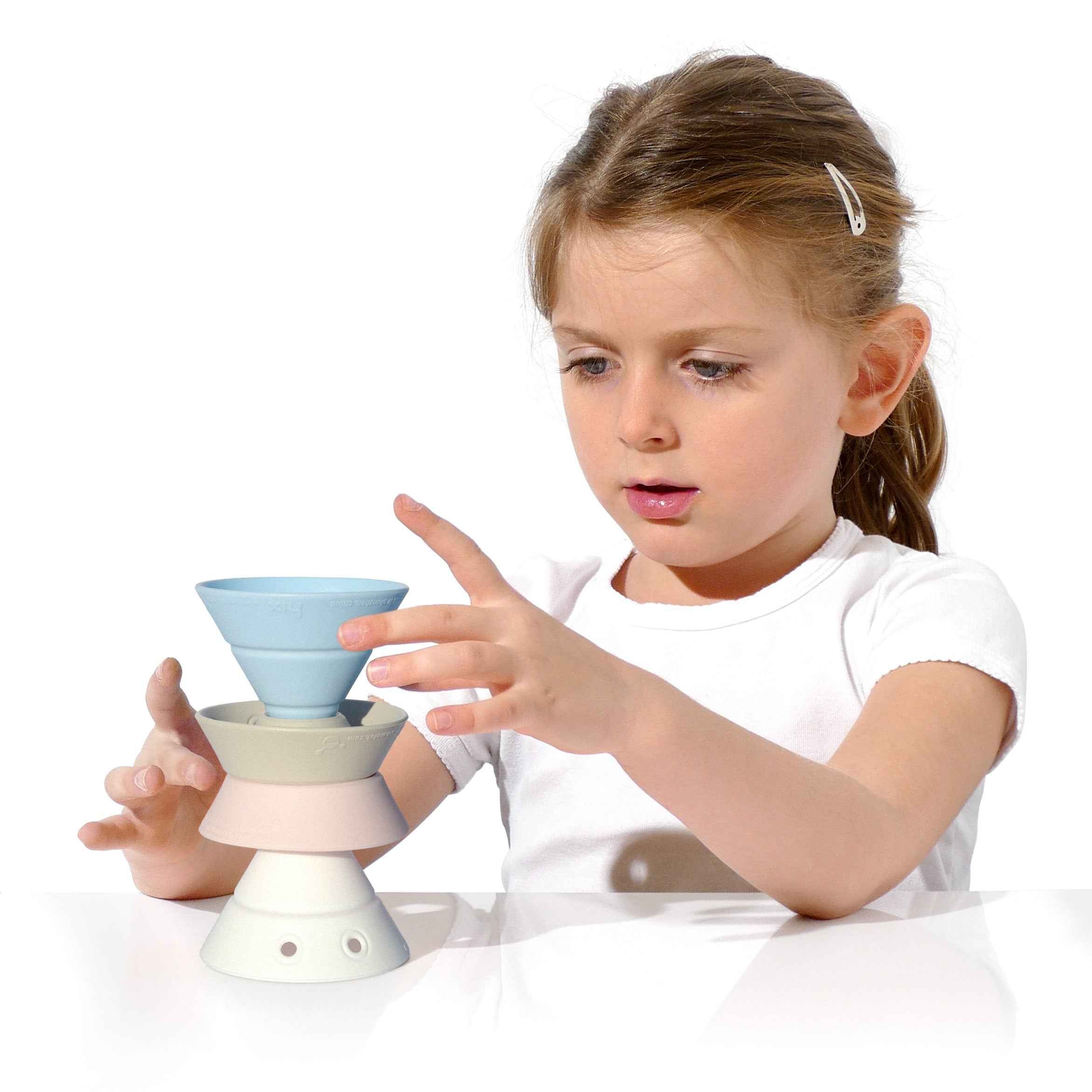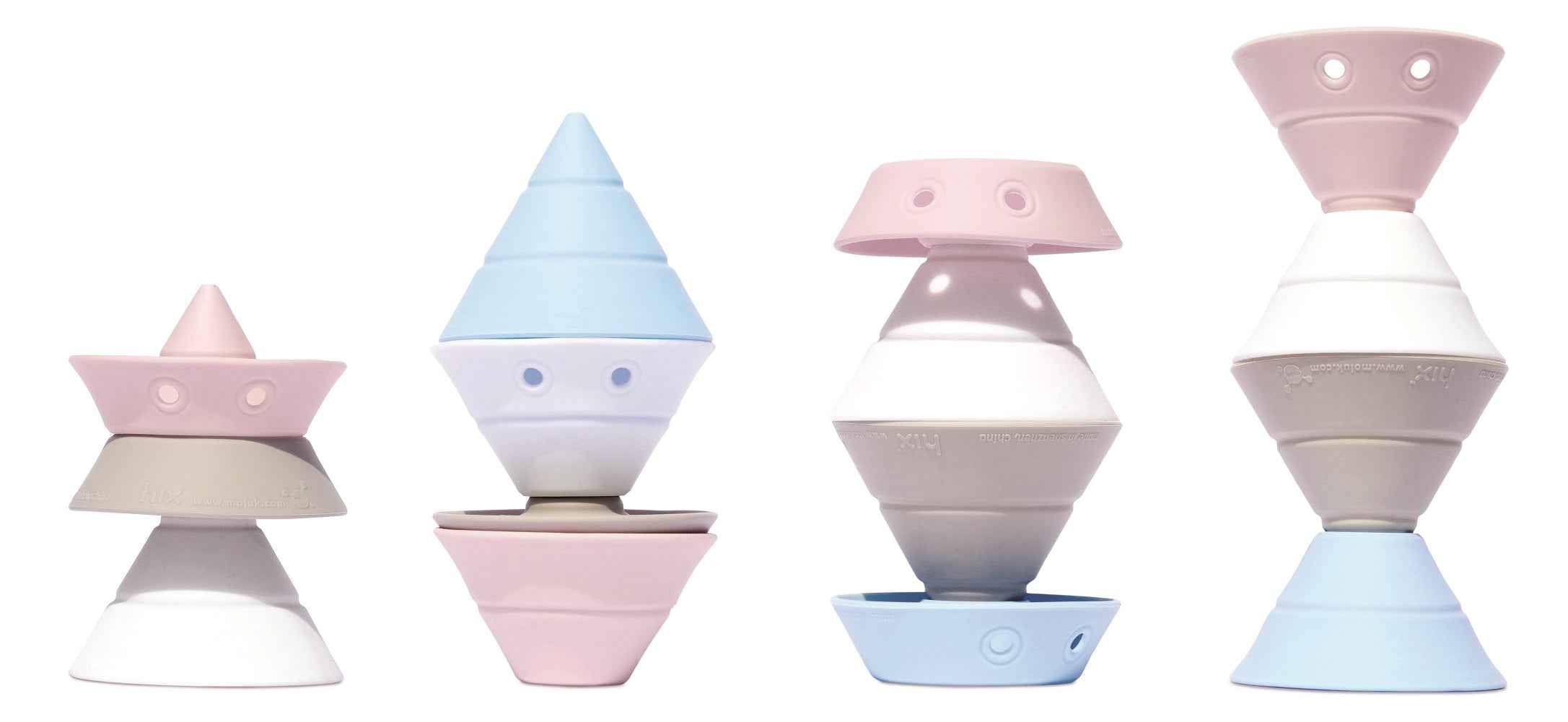 Das Set aus vier scheinbar gewöhnlichen Silikonkegeln sorgt für jede Menge Spielspaß. Jeder Block kann sich in 4 verschiedene Formen verwandeln, sehen Sie selbst, wie viele Kombinationen Sie schaffen können.