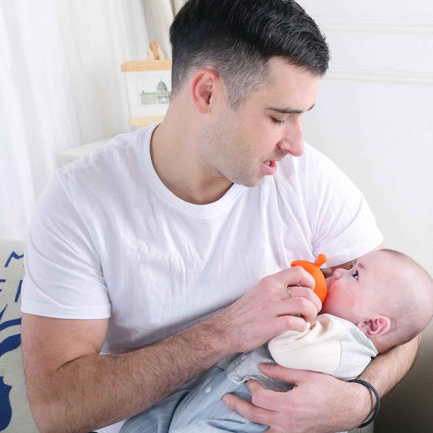 Der speziell entwickelte Beißring lindert die Schmerzen Ihres Kindes beim Zahnen. Die originelle Form, die an die Brust der Mutter erinnert, ermöglicht es dem Kind, am Beißring zu saugen. Zusätzlich kann er auch als Snackbecher mit Saugnapf verwendet werden. Einfach den Deckel umdrehen und schon ist der Becher fertig. Der Beißring fördert die Greiffähigkeiten des Kindes. Seine Form und Farbgebung regen das Kind zum Spielen an. Er ist spülmaschinen-, mikrowellen- und gefrierfachgeeignet.