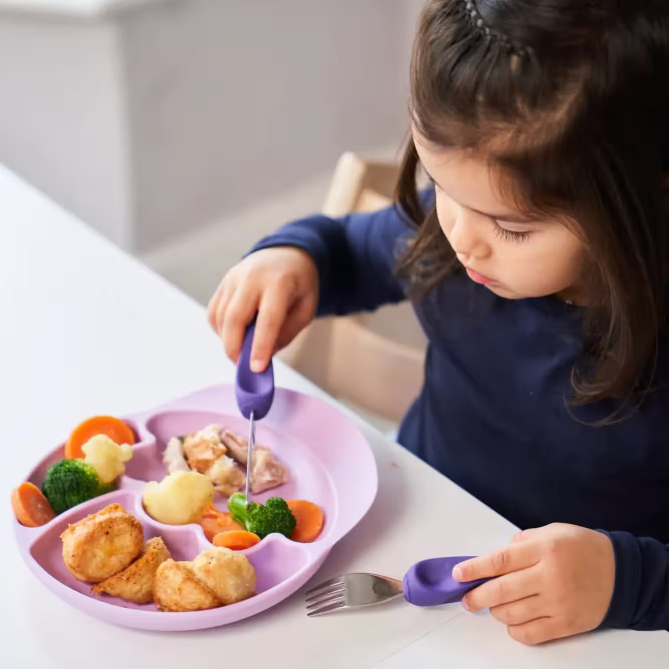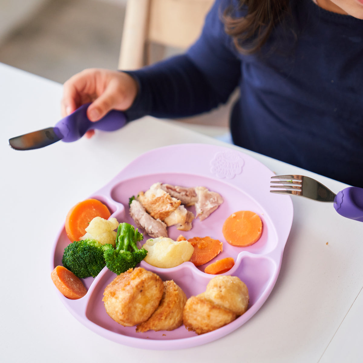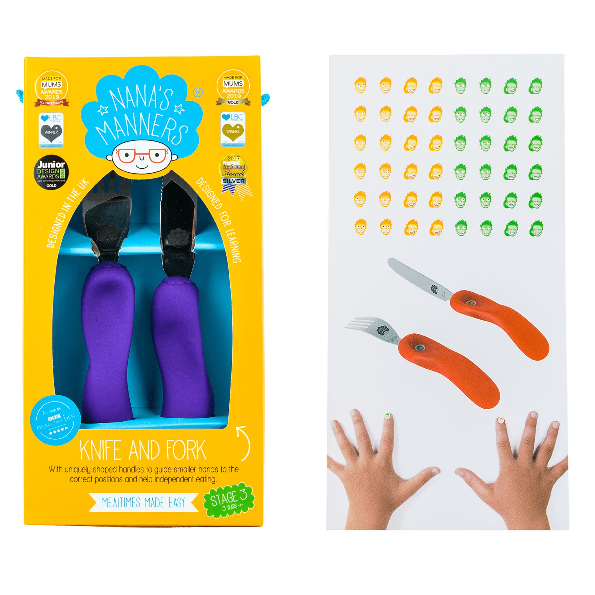 Das Stage 3 Set fördert die Selbstständigkeit, indem es Ihr Kind lehrt, Messer und Gabel selbstständig zu benutzen. Die preisgekrönten Nana's Manners sind das letzte Besteck, das Ihr Kind braucht, bevor es für das Besteck der Erwachsenen bereit ist.