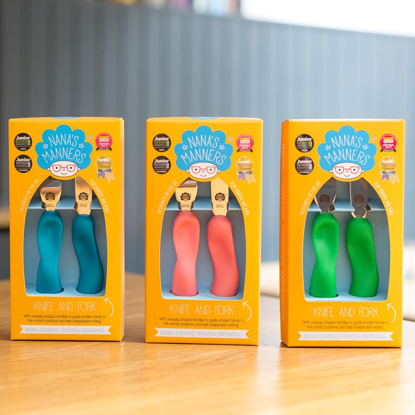 Das Stage 3 Set fördert die Selbstständigkeit, indem es Ihr Kind lehrt, Messer und Gabel selbstständig zu benutzen. Die preisgekrönten Nana's Manners sind das letzte Besteck, das Ihr Kind braucht, bevor es für das Besteck der Erwachsenen bereit ist.