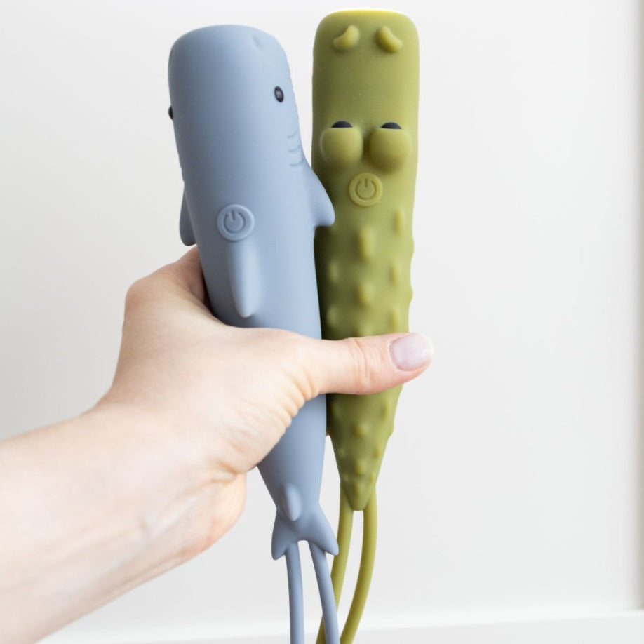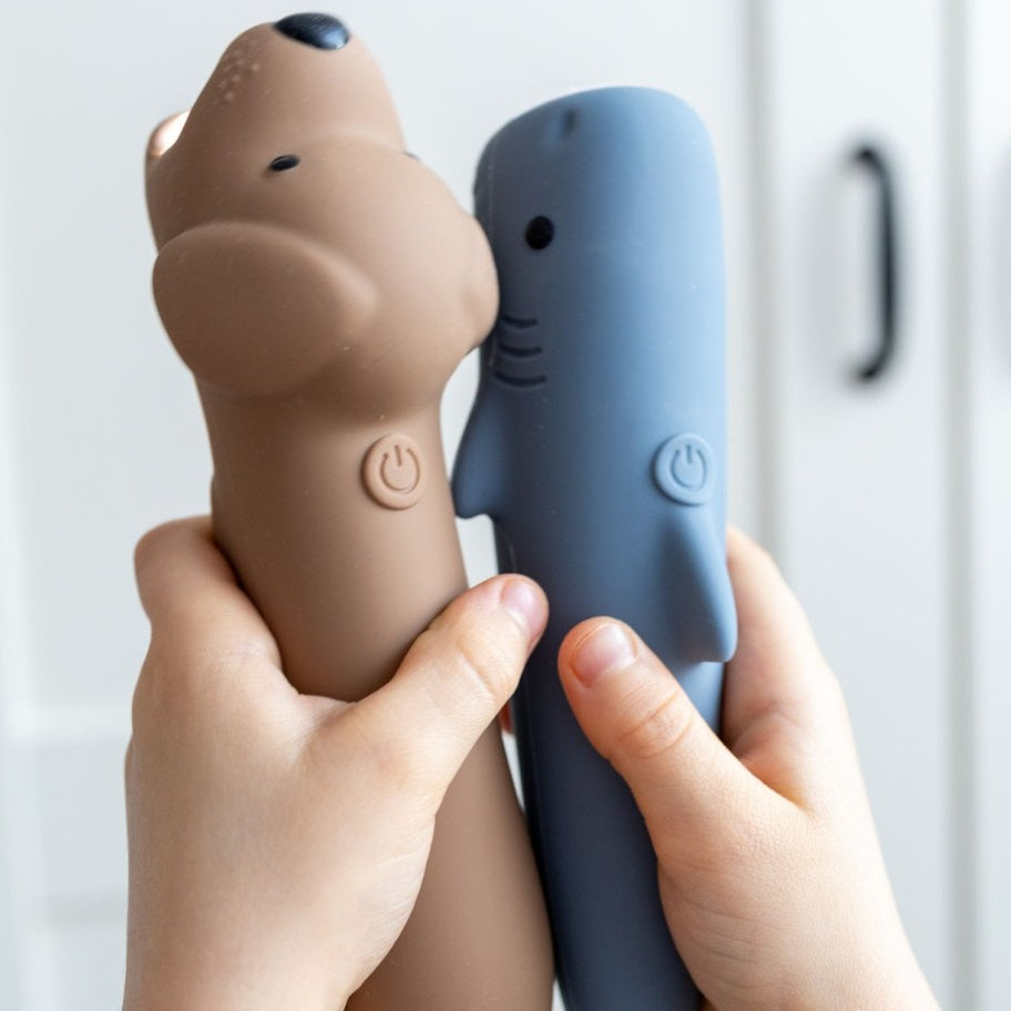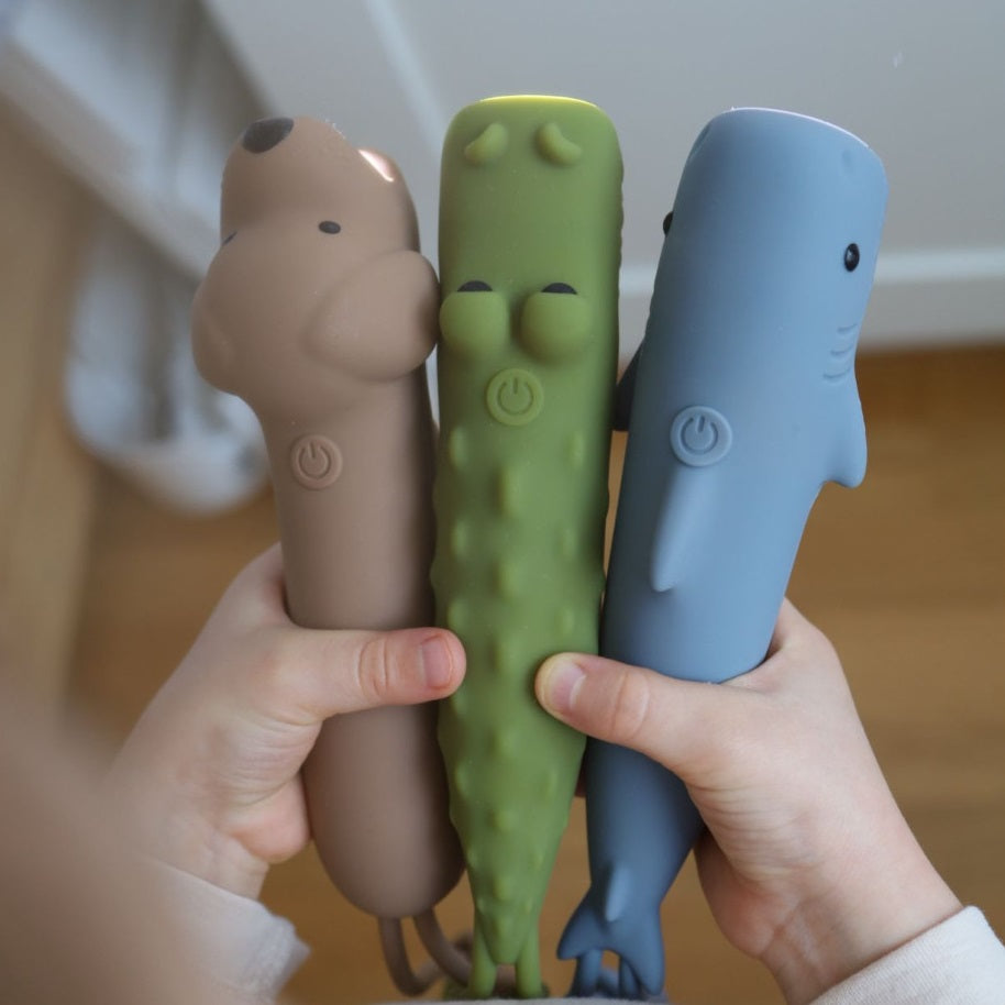 Entdecken Sie die einzigartige Taschenlampe in Form eines Hais von Rabbit & Friends – die perfekte Kombination aus Spaß und Funktionalität. Sie besteht aus weichem Silikon, passt sich perfekt an die Hände kleiner Entdecker an und dank ihrer Helligkeitsregelung kann das Licht an die Anforderungen jedes Abenteuers angepasst werden. Ideal für abendliche Geschichten, Schattenspiele oder zum Ausleuchten nächtlicher Ecken.
