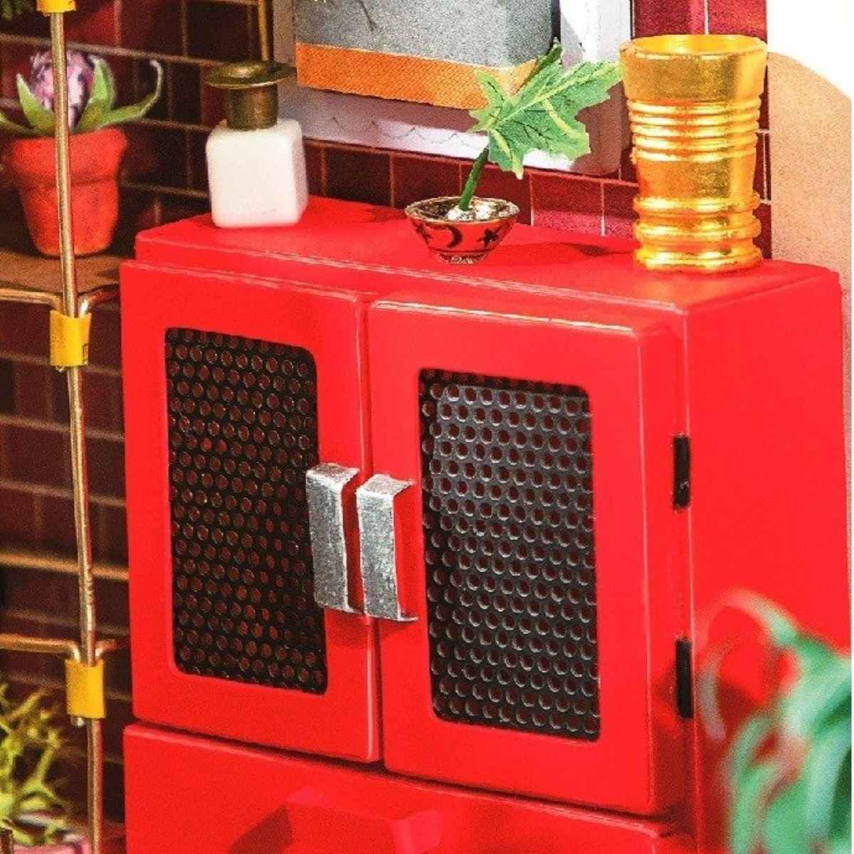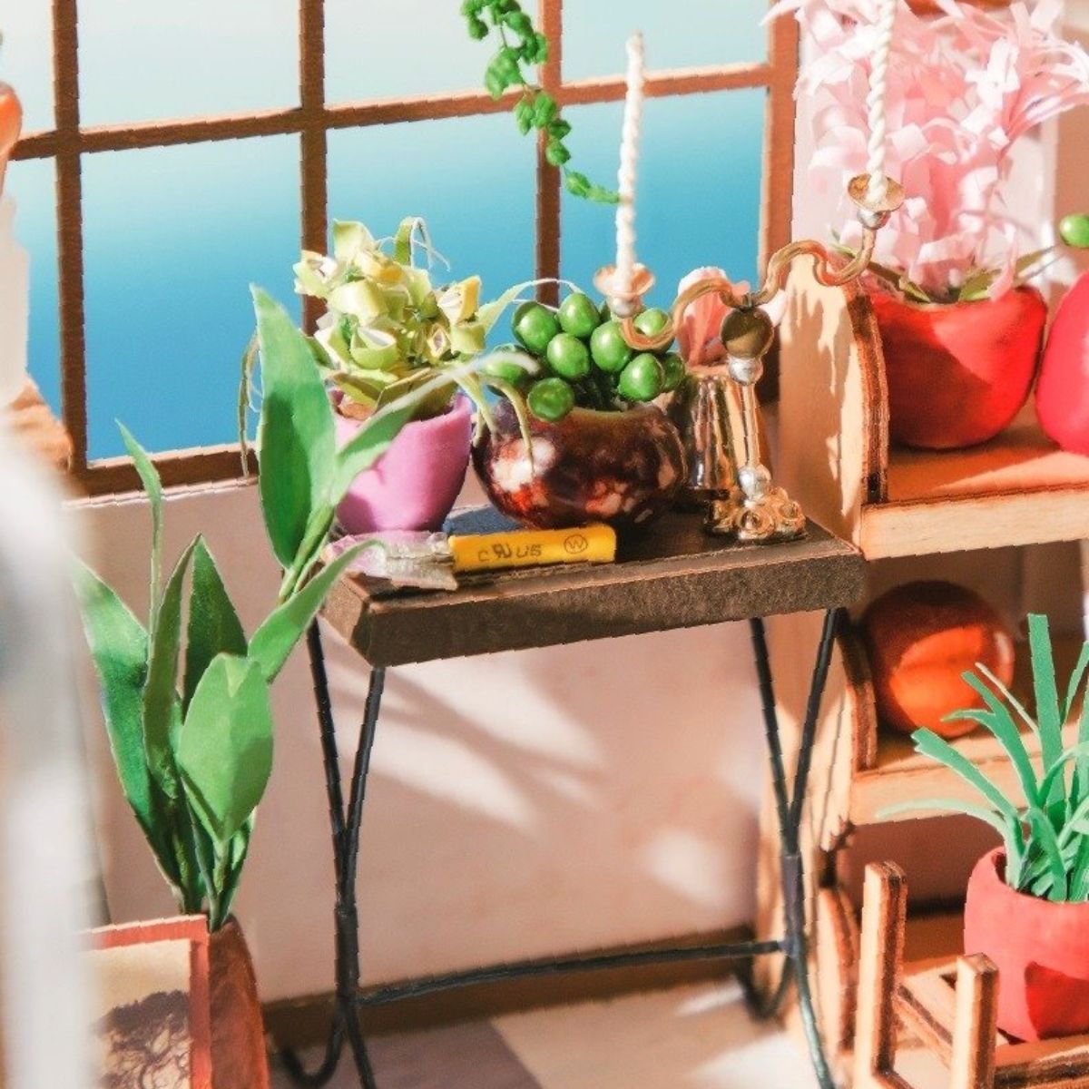 Ein Bausatz zum Zusammenbau eines Miniatur-Blumenladens mit LED-Beleuchtung. Für den Bau des Modells wurden unter anderem Holz, Papier, Stoffe, Draht, Kunststoff und verschiedene Dekorationselemente wie bunte Verzierungen, Pailletten, Perlen, Kunstblumen und viele andere Materialien verwendet.