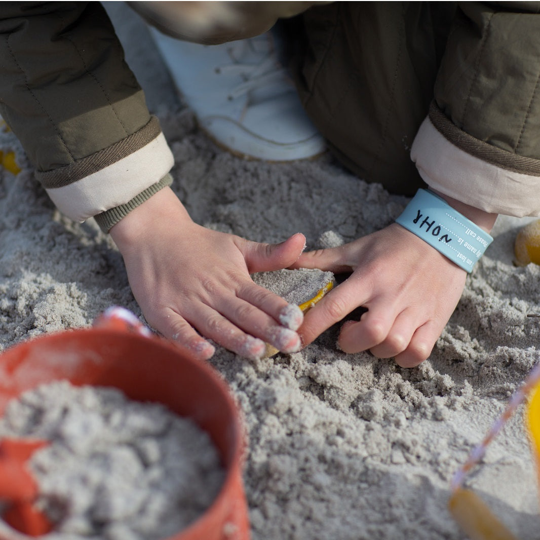 Sie müssen lediglich wichtige Informationen auf die Außenseite des Armbands schreiben: den Vor- und Nachnamen des Kindes sowie die Telefonnummer der Eltern. Dies erleichtert die Kontaktaufnahme mit den Betreuern und erspart Stress. Hergestellt aus angenehmem Silikon mit einer federnden Platte in der Mitte, dank der es sich um das Kinderhandgelenk festzieht. Diese Lösung sorgt für eine perfekte Passform am Handgelenk. Einheitsgröße – passt sogar an Erwachsenenhände.