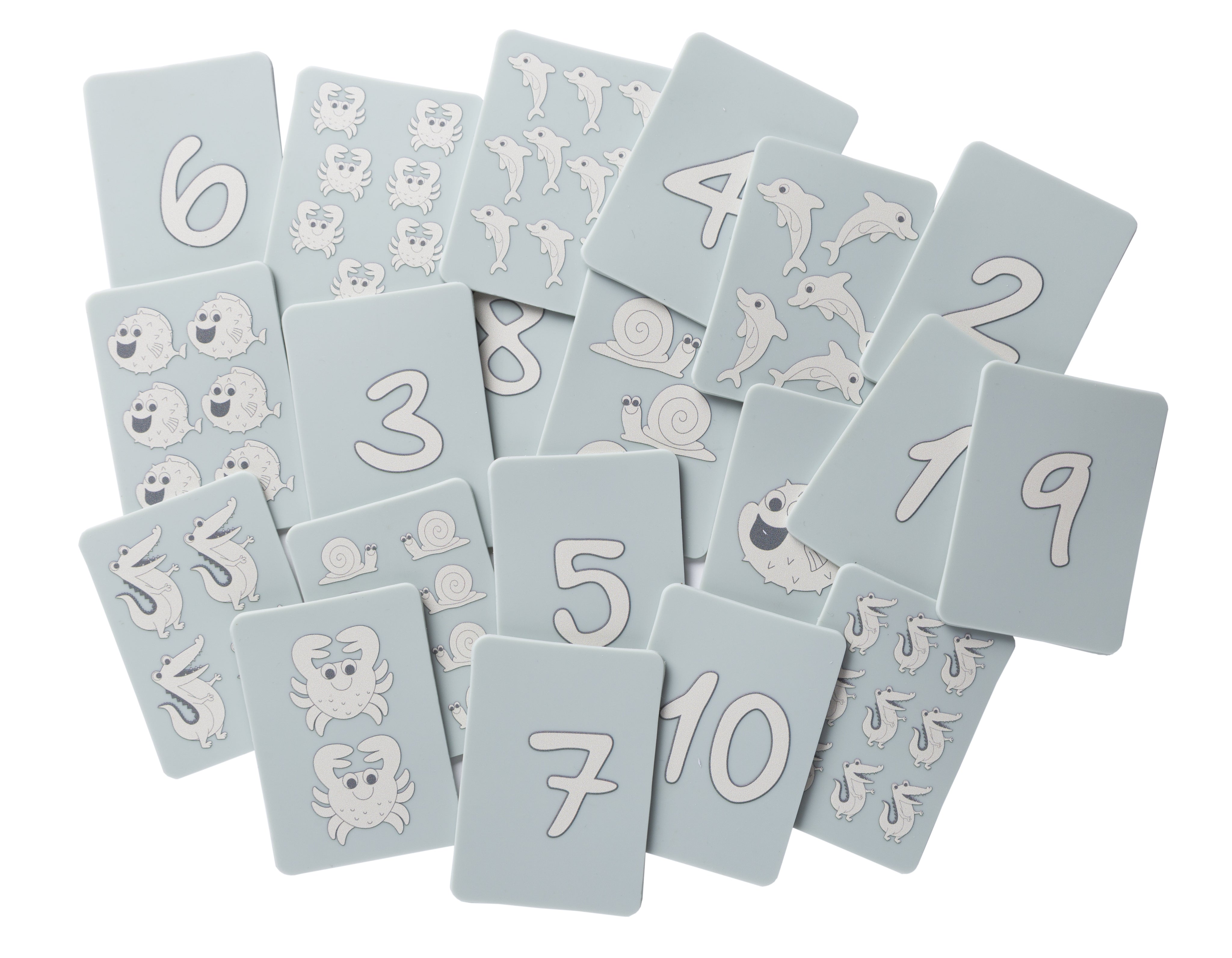 Leichte und handliche Scrunch-Karten zum Spielen und Lernen von Zahlen und Zählen. Ideal zum Spielen am Strand, zu Hause und beim Baden. Das Set enthält: 20 Karten, davon 10 Karten mit den Zahlen von 1 bis 10, und weitere 10 Karten mit einer Illustration mit Tieren in Zahlen, die den Bezeichnungen auf den Zahlenkarten entsprechen.