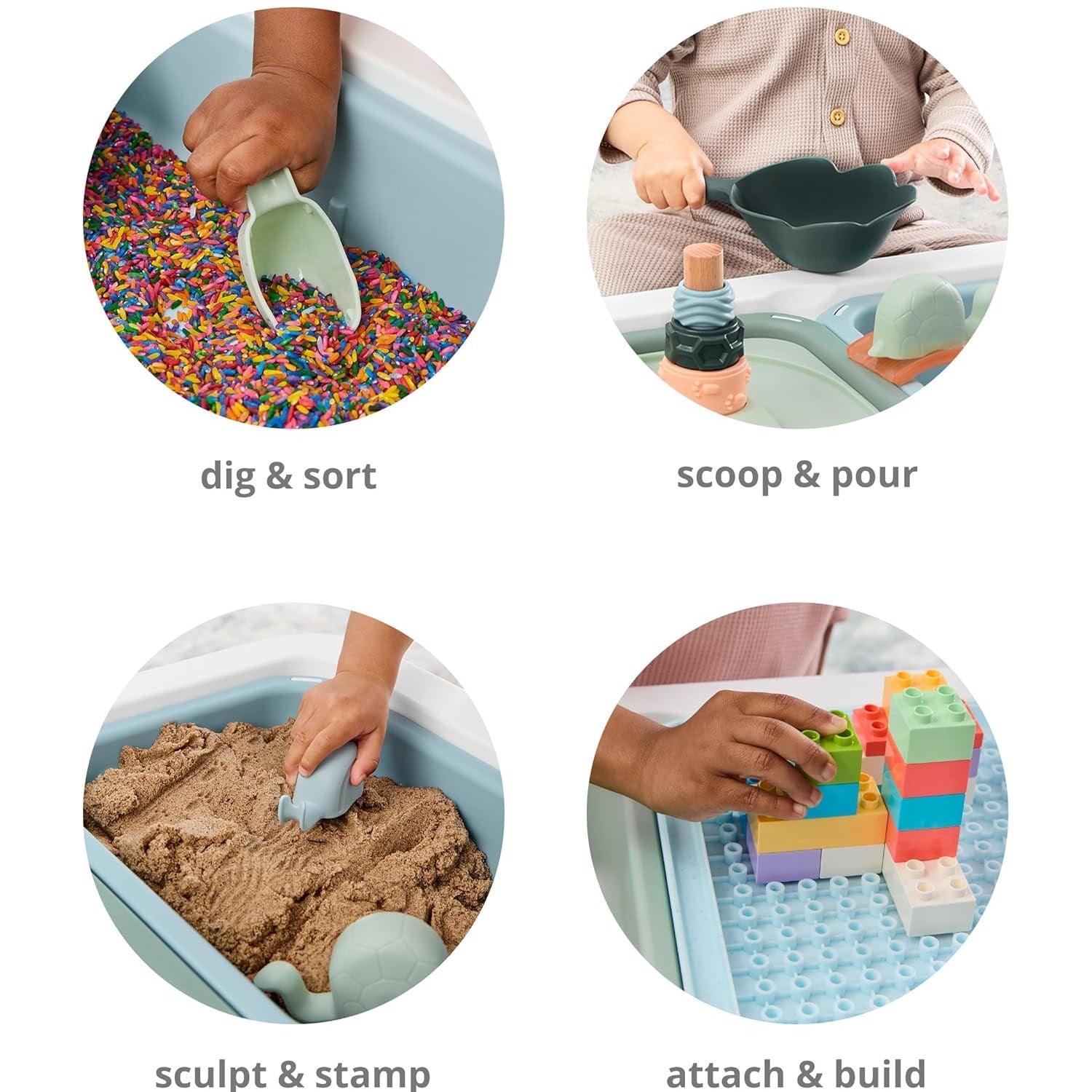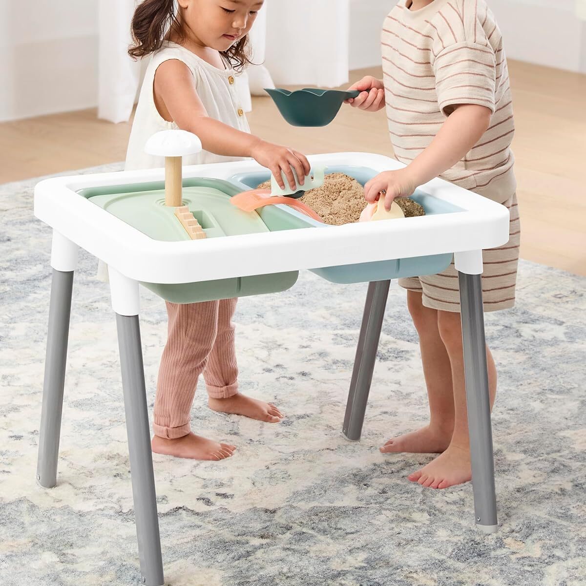 Wenn Ihr Kind größer wird, befestigen Sie die höheren Tischbeine und experimentieren Sie mit Sand, trockenen Nudeln, Wasser, Knete, kinetischem Sand usw. Backen Sie Kuchen, formen Sie Skulpturen, schöpfen Sie, schütten Sie aus und vieles mehr – lassen Sie Ihrer Fantasie freien Lauf!