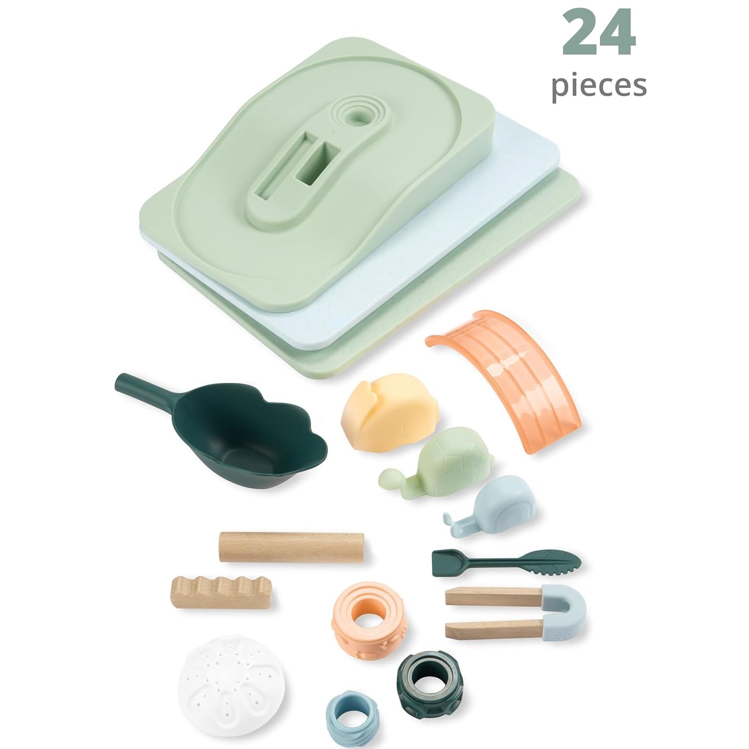 Entwickelt, um mit Ihrem Kind mitzuwachsen: Die erste sensorische Entdeckung beginnt mit dem Spielen auf dem Boden und den mitgelieferten Werkzeugen (Holzpinzetten und -roller, Schaufeln in Tierform und vieles mehr) – die sich auf vielfältige Weise verwenden lassen!