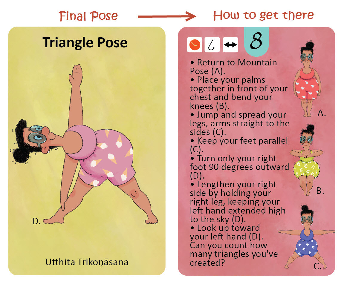 - Jede Karte enthält den Namen des Positions in Englisch und Sanskrit, eine Illustration und eine Schritt-für-Schritt-Anleitung.