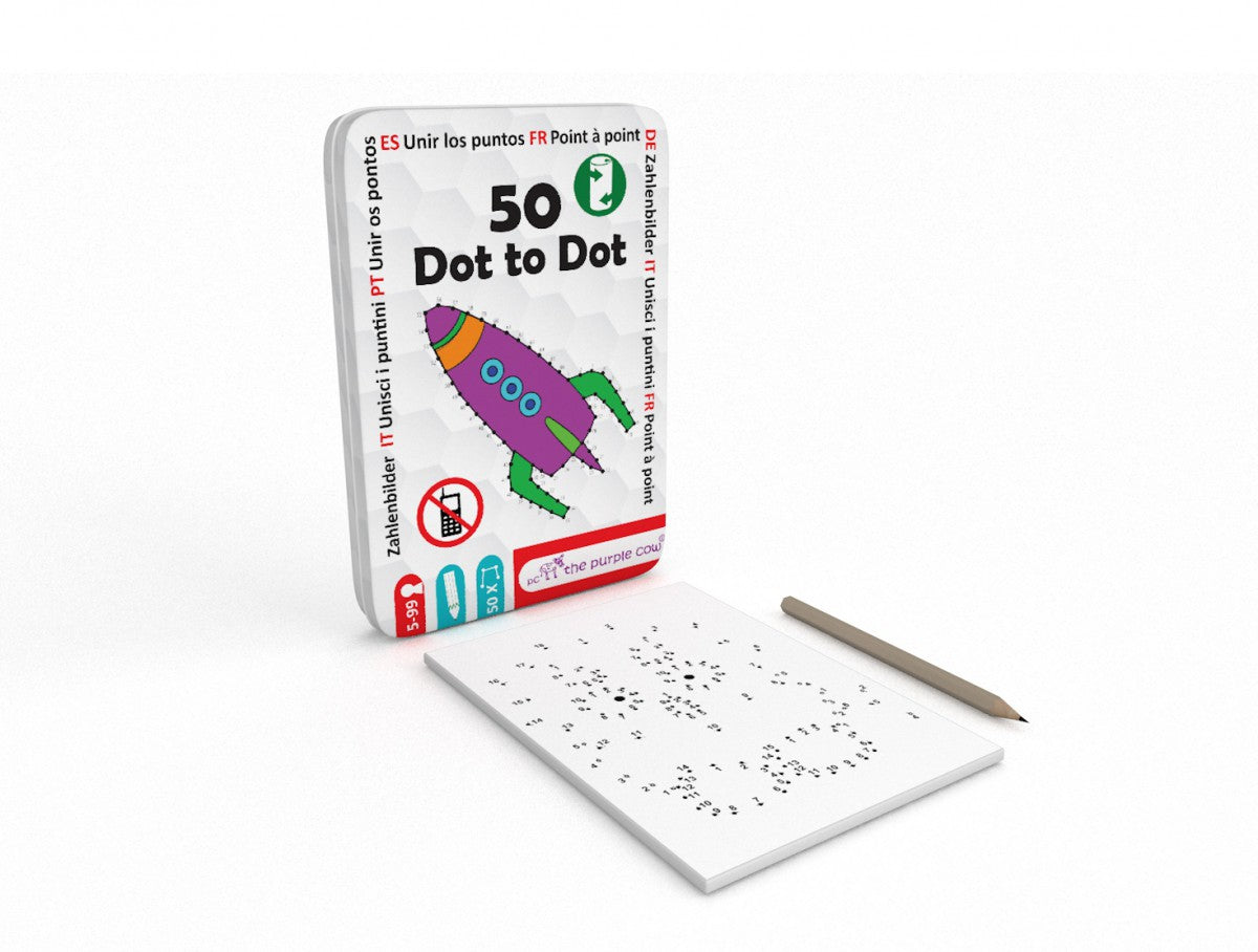 Ein Spielzeug, das Sie überallhin mitnehmen können. Es beruhigt perfekt und trainiert die Konzentration. Die Reisepuzzles Verbinde die Punkte The Purple Cow bestehen aus 50 Aufgaben mit steigendem Schwierigkeitsgrad. Verbinde die Punkte zu einem Ganzen und finde heraus, was dein Bild darstellt. Dank seiner kompakten Größe und der praktischen Metallverpackung eignet sich das Set hervorragend für Reisen, im Auto, im Flugzeug oder im Restaurant.