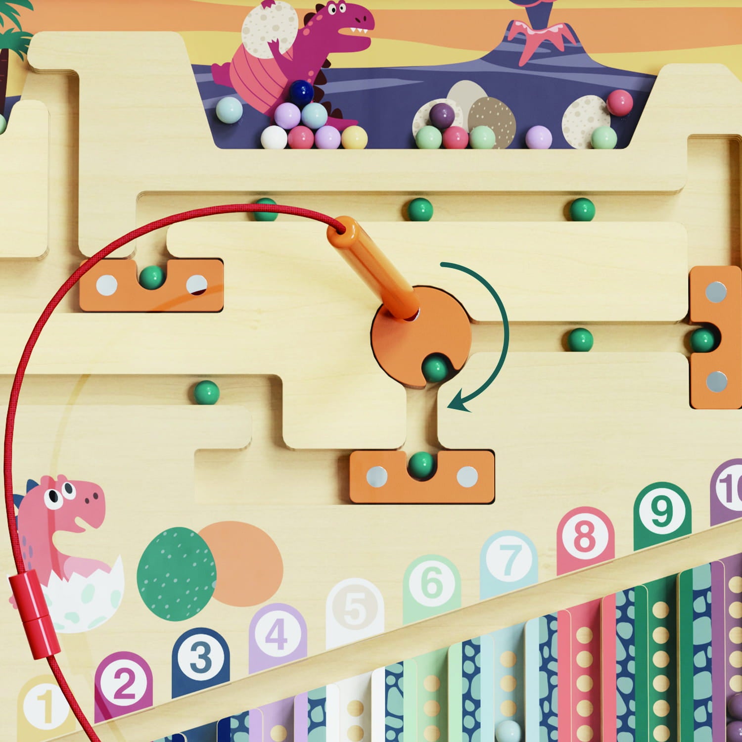 Mit einem speziellen Magnetstift tragen die Kinder die bunten Dinosauriereier durch das Labyrinth zu den Nestern. Die Kinder lernen nicht nur zu zählen, sondern üben auch Koordination, Konzentration und logisches Denken, indem sie die Hindernisse im Labyrinth umgehen.