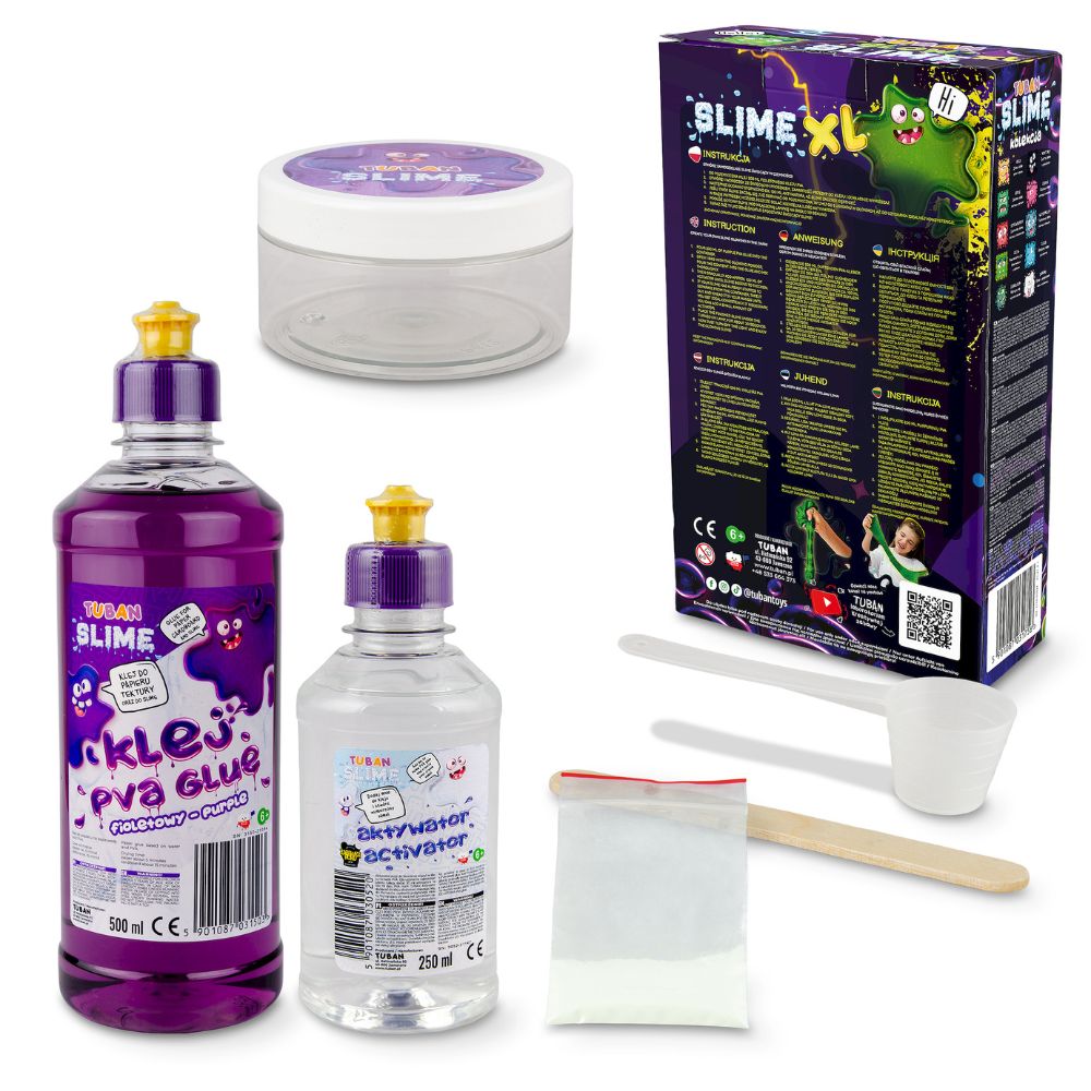- Inhalt des Sets: 500 ml lila PVA-Kleber, 250 ml Aktivator, Leuchtpulver 1,5 g, Spatel zum Mischen der Zutaten, SLIME-Aufbewahrungsbehälter.