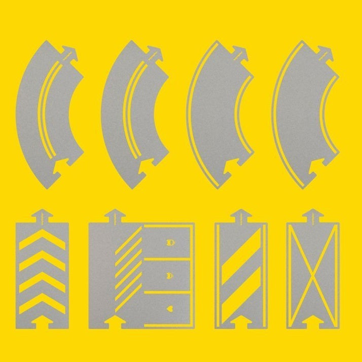 - Das Set enthält 8 Elemente – 4 Kurven + 3 Geraden + 1 breiter Parkplatz.